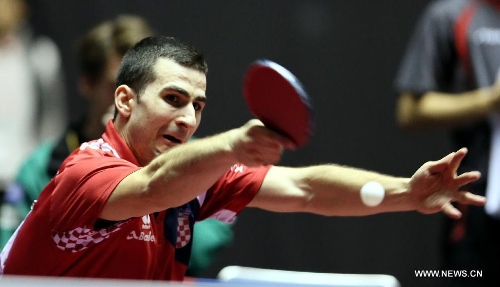 Andrej Gacina of Croatia hits a return during his men's singles round three match against Timo Boll of Germany at the 2014 World Team Table Tennis Championships in Tokyo on April 30, 2014. Boll won 3-1 and Germany won 3-0. (Xinhua/Li Peng)