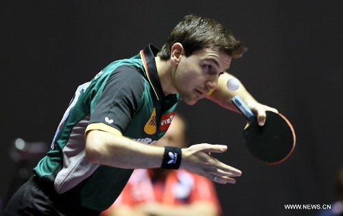 Timo Boll of Germany serves during his men's singles round three match against Andrej Gacina of Croatia at the 2014 World Team Table Tennis Championships in Tokyo on April 30, 2014. Boll won 3-1 and Germany won 3-0. (Xinhua/Li Peng)