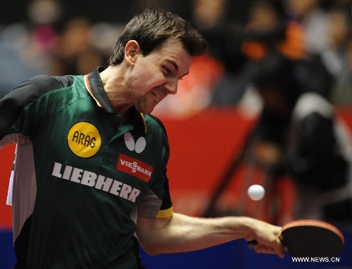 Timo Boll of Germany returns a shot to Wong Chun Ting of China's Hong Kong during the men's singles match at Zen Noh 2014 World Team Table Tennis Championships in Tokyo, Japan, April 30, 2014. (Xinhua/Stringer)