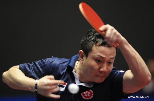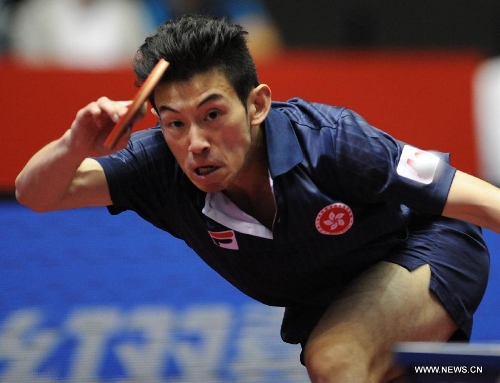 Wong Chun Ting of China's Hong Kong returns a shot to Timo Boll of Germany during the men's singles match at Zen Noh 2014 World Team Table Tennis Championships in Tokyo, Japan, April 30, 2014. (Xinhua/Stringer)