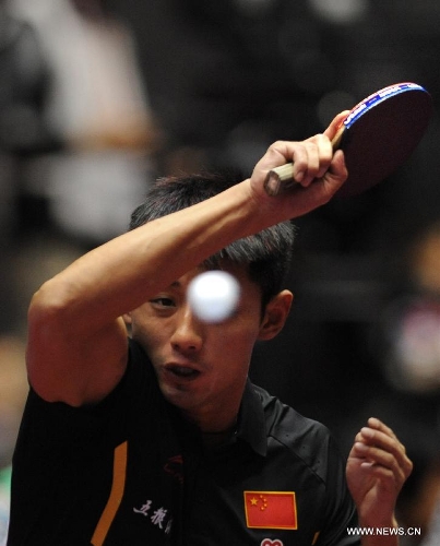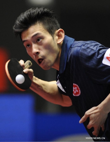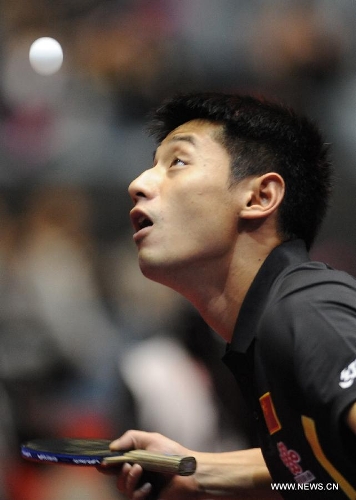 Zhang Jike of China returns a shot to Stefan Fegerl of Austria during the men's singles match at Zen Noh 2014 World Team Table Tennis Championships in Tokyo, Japan, April 30, 2014. (Xinhua/Stringer)