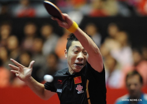 Xu Xin of China returns a shot to Habesohn Daniel of Austria during the men's singles match at Zen Noh 2014 World Team Table Tennis Championships in Tokyo, Japan, April 30, 2014. (Xinhua/Stringer)