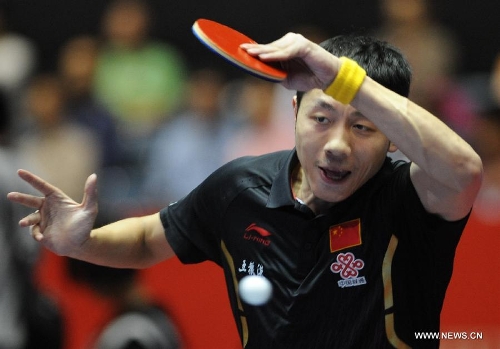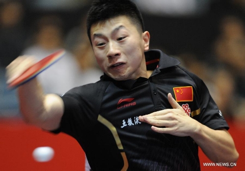 Ma Long of China returns a shot to Robert Gardos of Austria during the men's singles match at Zen Noh 2014 World Team Table Tennis Championships in Tokyo, Japan, April 30, 2014. (Xinhua/Stringer)