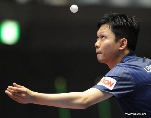 Zhang Jike of China serves to Stefan Fegerl of Austria during the men's singles match at Zen Noh 2014 World Team Table Tennis Championships in Tokyo, Japan, April 30, 2014. (Xinhua/Stringer)