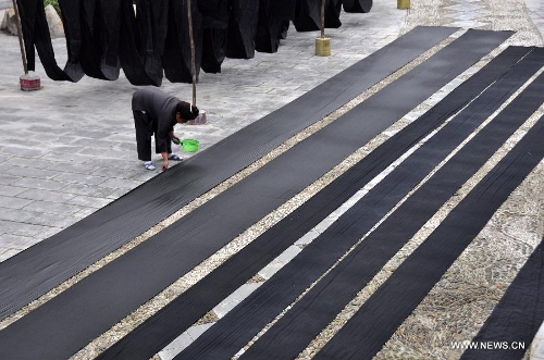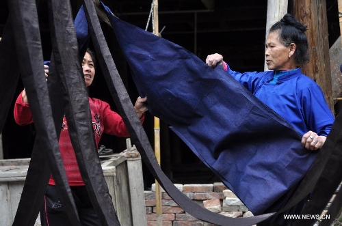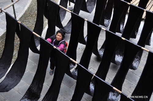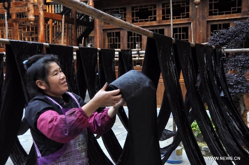 Woman of the Dong ethnic group air the newly-made cloth in Zhaoxing Dong Village of Liping County, southwest China's Guizhou Province, April 30, 2014. The handmade cloth is mainly used by local people to make traditional costumes of the Dong ethnic group. (Xinhua/Yang Wenbin)