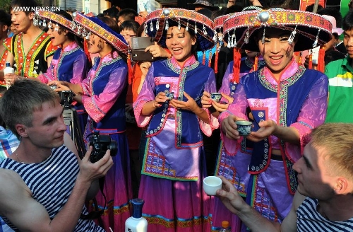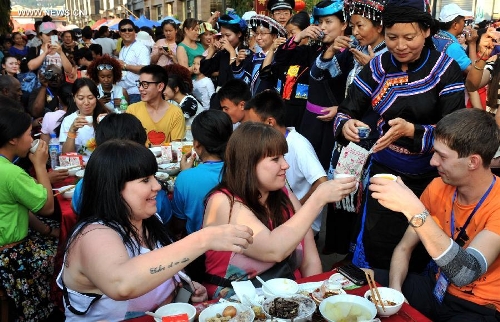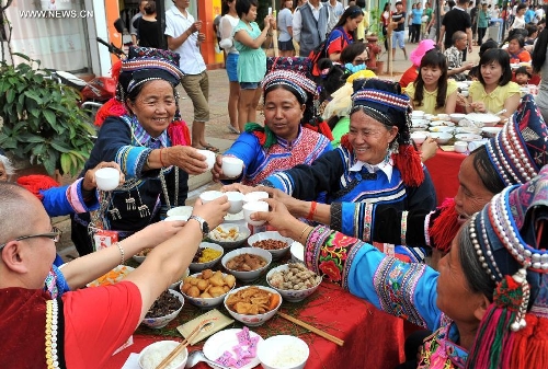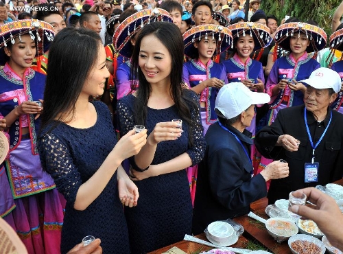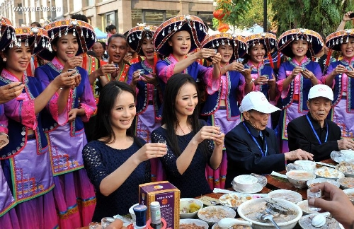 Twins and tourists enjoy a feast during the 10th twins festival in the Hani Autonomous County of Mojiang, southwest China's Yunnan Province, May 1, 2014. A traditional Hani nationality feast on 1-kilometer-long table was held here on Thursday during the festival with participation of more than 1,000 pairs of twins and triplets. (Xinhua/Chen Haining)