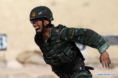 A Chinese competitor takes part in the 6th annual Warrior Competition at the King Abdullah II Special Operation Training Center in Amman, capital of Jordan, May 1, 2014. The five-day competition kicked off here on Wednesday with the participation of 38 teams from 19 countries. (Xinhua/Mohammad Abu Ghosh)