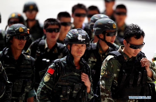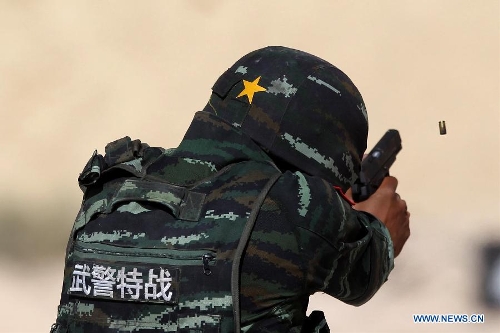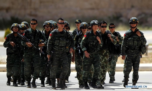 Chinese competitors take part in the 6th annual Warrior Competition at the King Abdullah II Special Operation Training Center in Amman, capital of Jordan, May 1, 2014. The five-day competition kicked off here on Wednesday with the participation of 38 teams from 19 countries. (Xinhua/Mohammad Abu Ghosh)