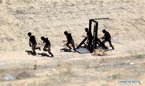 Palestinian competitors take part in the 6th annual Warrior Competition at the King Abdullah II Special Operation Training Center in Amman, capital of Jordan, May 1, 2014. The five-day competition kicked off here on Wednesday with the participation of 38 teams from 19 countries. (Xinhua/Mohammad Abu Ghosh)