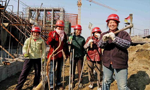 Women laborers on a construction site smile for the camera. There are an increasing number of women working as construction laborers in Shanghai. Photo: CFP