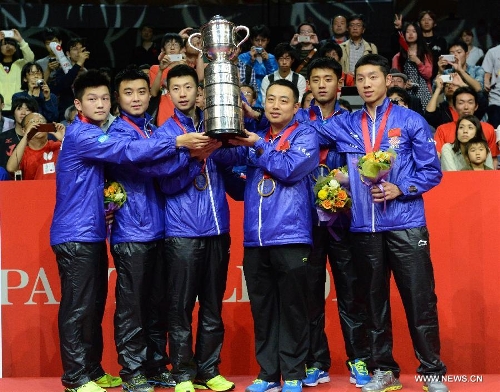 Chinese team members pose with the trophy during the awarding ceremony for the men's group event in Zen Noh 2014 World Table Tennis Championships in Tokyo, Japan, May 5, 2014. China beat Germany 3-1 in the final and claimed the title of the event. (Xinhua/Li Peng)