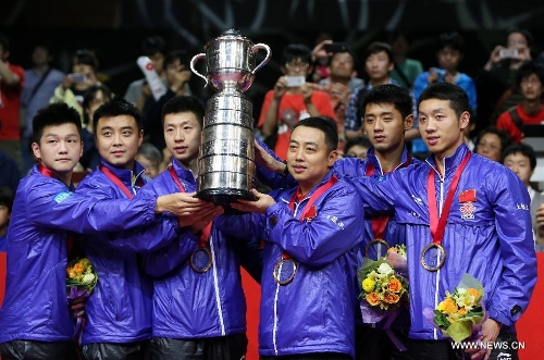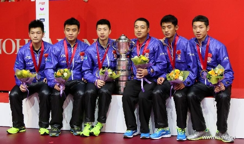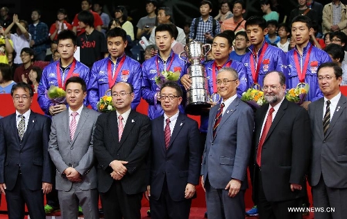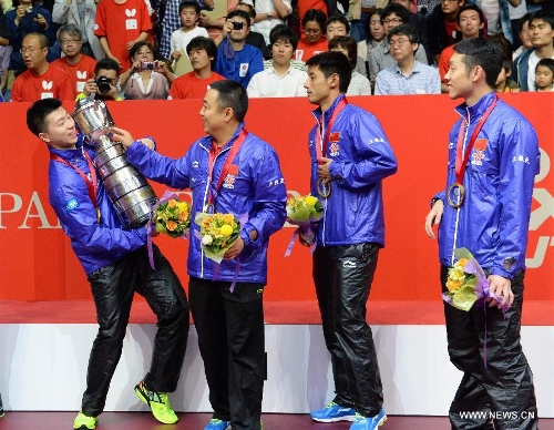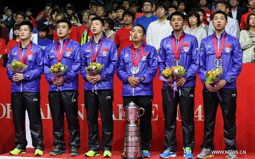 Chinese team members pose during the awarding ceremony for the men's group event in Zen Noh 2014 World Table Tennis Championships in Tokyo, Japan, May 5, 2014. China beat Germany 3-1 in the final and claimed the title of the event. (Xinhua/Li Peng)