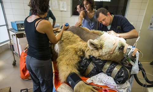 Mango, a 19-year-old male Syrian brown bear, is sedated and has the fur on his back shaved as he is prepared for an operation to treat a slipped disk at the Ramat Gan Safari park, in Israel on Wednesday. This is reportedly the first operation of its kind ever to take place. Photo: CFP