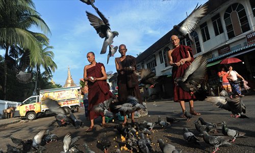 Buddhist monks feed pigeons near the Shwedagon pagoda in Yangon on Friday. Myanmar is to hold the 24th ASEAN Summit in the capital Nay Pyi Taw on Saturday and Sunday. Photo: AFP