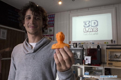 Ezequiel Mendoza, a client of the 3D LAB, shows a bust of himself made by a 3D printer in the 3D LAB fab&cafe in Buenos Aires, capital of Argentina, May 9, 2014. The 3D LAB fab&café is a cafe and cooperative work space that offers 3D printer machines to the clients. (Xinhua/Martin Zabala)