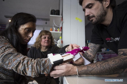 Rodrigo Perez Weiss (L), owner of the 3D LAB fab&cafe, fits an orthopedic hand made by a 3D printer to Gabriela Cugliandolo in the 3D LAB fab&cafe in Buenos Aires, capital of Argentina, May 9, 2014. Gabriela suffered an accident at age 4, that caused burns in 80 percent of her body, and the loss of her right hand. The 3D LAB fab&café is a cafe and cooperative work space that offers 3D printer machines to the clients. (Xinhua/Martin Zabala)