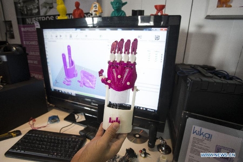 Rodrigo Perez Weiss, owner of the 3D LAB fab&cafe, shows an orthopedic hand made by a 3D printer in the 3D LAB fab&cafe in Buenos Aires, capital of Argentina, May 9, 2014. The 3D LAB fab&café is a cafe and cooperative work space that offers 3D printer machines to the clients. (Xinhua/Martin Zabala)