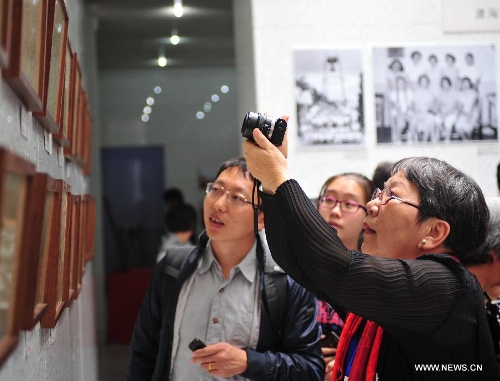 Poet Hsi Muren (R) takes photos at an exhibition about sholar Ye Jiaying during an event to mark Ye's 90th birthday at Nankai University in Tianjin, north China, May 10, 2014. Ye is a professor of classical Chinese literature and also a tenured faculty member at the University of British Columbia in Canada. (Xinhua/Zhang Chenlin)