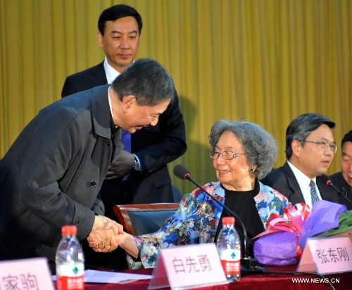 Ye Jiaying (R), famous scholar of Chinese literature, shakes hand with writer Pai Hsien-yung during an event to mark Ye's 90th birthday at Nankai University in Tianjin, north China, May 10, 2014. Ye is a professor of classical Chinese literature and also a tenured faculty member at the University of British Columbia in Canada. (Xinhua/Zhang Chenlin)