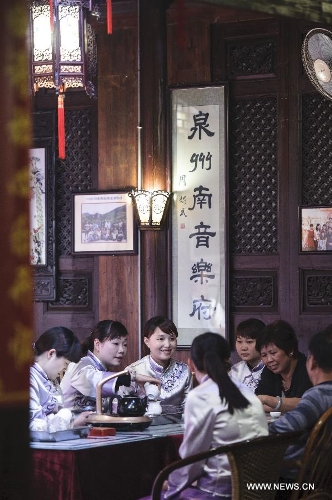 Performers of Nanyin, an ancient Chinese folk music art form originated from southeast China's Fujian Province, chat with each other at a tea house in Quanzhou, Fujian Province, May 8, 2014. Nanyin, known as the "living fossil" of ancient Chinese music, literally means music in the south and is a traditional opera in Fujian dialect. Nanyin was spread to Southeast Asia and also introduced to Europe and America by thousands of overseas Chinese, when the Maritime Silk Road flourished during ancient China's Song(960-1279) and Yuan(1271-1368) Dynasties. In 2006, Nanyin was enlisted as a National Non-material Cultural Heritage. Three years later, it was listed as a World Human Verbal and Intangible Cultural Heritage by UNESCO. (Xinhua/Jiang Kehong)