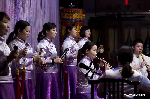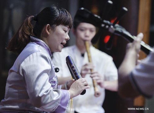 Performers of Nanyin, an ancient Chinese folk music art form originated from southeast China's Fujian Province, stage at a tea house in Quanzhou, Fujian Province, May 8, 2014. Nanyin, known as the "living fossil" of ancient Chinese music, literally means music in the south and is a traditional opera in Fujian dialect. Nanyin was spread to Southeast Asia and also introduced to Europe and America by thousands of overseas Chinese, when the Maritime Silk Road flourished during ancient China's Song(960-1279) and Yuan(1271-1368) Dynasties. In 2006, Nanyin was enlisted as a National Non-material Cultural Heritage. Three years later, it was listed as a World Human Verbal and Intangible Cultural Heritage by UNESCO. (Xinhua/Shen Bohan)
