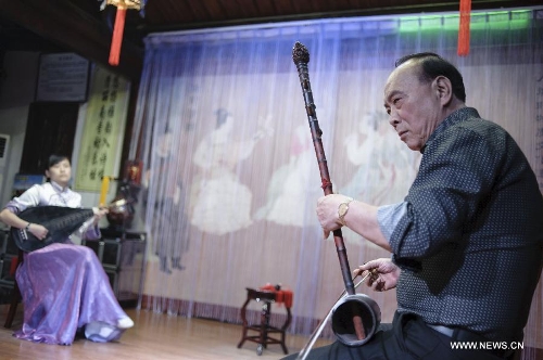 Xia Yongxi(R), an inheritor of Nanyin, an ancient Chinese folk music art form originated from southeast China's Fujian Province, plays erxian, a two-stringed instrument, at a tea house in Quanzhou, Fujian Province, May 8, 2014. Nanyin, known as the "living fossil" of ancient Chinese music, literally means music in the south and is a traditional opera in Fujian dialect. Nanyin was spread to Southeast Asia and also introduced to Europe and America by thousands of overseas Chinese, when the Maritime Silk Road flourished during ancient China's Song(960-1279) and Yuan(1271-1368) Dynasties. In 2006, Nanyin was enlisted as a National Non-material Cultural Heritage. Three years later, it was listed as a World Human Verbal and Intangible Cultural Heritage by UNESCO. (Xinhua/Jiang Kehong)