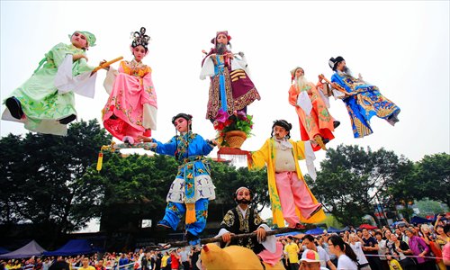 Children perform at a 600-year-old folk festival to celebrate the birth of Lü Dongbin, one of the eight major immortals of Taoism on Monday in Foshan, Guangdong Province. The theme of this year's festival is health and fitness. Photo: CFP