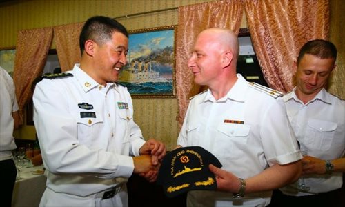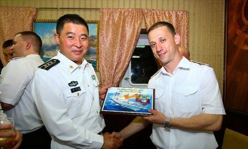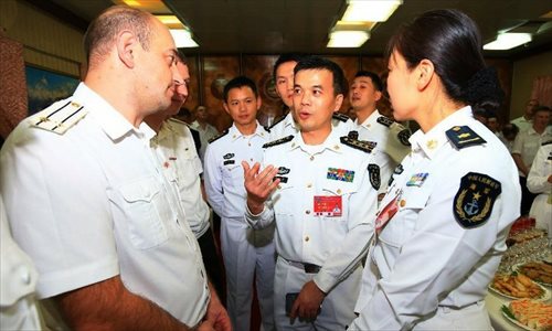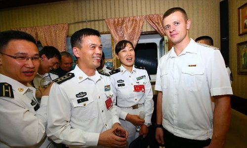 Chinese and Russian officers communicate during a reception held on the Russian guided missile cruiser Varyag in Shanghai, east China, May 19, 2014. Chinese and Russian naval forces held interchange activities on Monday to enhance mutual communication. The "Joint Sea-2014" drill will be held in the northern part of the East China Sea between May 20 and 26. Photo: Xinhua