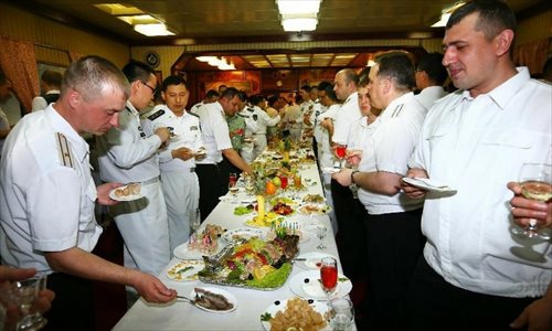 Chinese and Russian officers and soldiers are seen at a buffet during a reception held on the Russian guided missile cruiser Varyag in Shanghai, east China, May 19, 2014. Chinese and Russian naval forces held interchange activities on Monday to enhance mutual communication. The "Joint Sea-2014" drill will be held in the northern part of the East China Sea between May 20 and 26. Photo: Xinhua