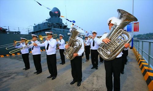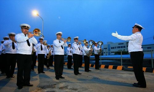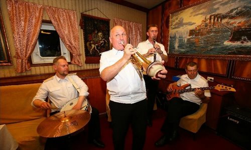 A band performs during a reception held on the Russian guided missile cruiser Varyag in Shanghai, east China, May 19, 2014. Chinese and Russian naval forces held interchange activities on Monday to enhance mutual communication. The "Joint Sea-2014" drill will be held in the northern part of the East China Sea between May 20 and 26. Photo: Xinhua