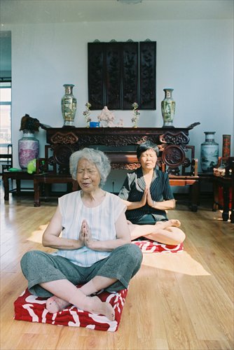 Two elderly Buddhists pray at home. Photo: Zhao Liwen/Sina