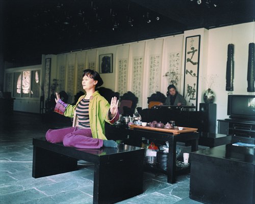 Mr Fan, an artist, plays the guqin while his wife practices yoga at their home. Photo: Zhao Liwen/Sina