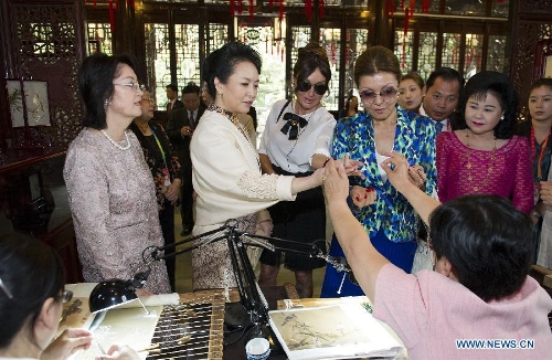 Peng Liyuan (2nd L, front), wife of Chinese President Xi Jinping, Bun Rany (R, front), wife of Cambodian Prime Minister Hun Sen, Mehriban Aliyeva (3rd R, front), wife of Azerbaijan's president Ilham Aliyev, Raisa Atambayeva (L, front), wife of Kyrgyz President Almazbek Atambayev and Dargia Nazarbayeva (2nd R, front), daughter of Kazakhstan's President Nursultan Nazarbayev, watch Su Huiping, a successor of Chinese non-material cultural heritage Gu Embroidery, demonstrating the craft of Gu Embroidery in Shanghai, May 21, 2014. The fourth summit of the Conference on Interaction and Confidence Building Measures in Asia (CICA) opened in Shanghai on Wednesday. (Xinhua/Huang Jingwen)