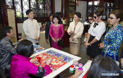 Peng Liyuan (4th R, front), wife of Chinese President Xi Jinping, Bun Rany (5th R, front), wife of Cambodian Prime Minister Hun Sen, Mehriban Aliyeva (2nd R, front), wife of Azerbaijan's president Ilham Aliyev, Raisa Atambayeva, wife of Kyrgyz President Almazbek Atambayev (3rd R, front) and Dargia Nazarbayeva, daughter of Kazakhstan's President Nursultan Nazarbayev (R, front), watch a demonstration of rural paintings, in Shanghai, May 21, 2014. The fourth summit of the Conference on Interaction and Confidence Building Measures in Asia (CICA) opened in Shanghai on Wednesday. (Xinhua/Huang Jingwen)