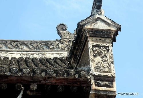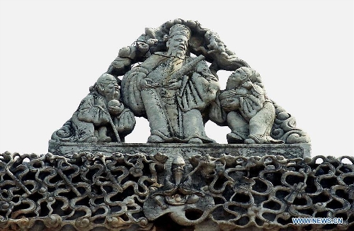 Photo taken on Aug. 5, 2013 shows a brick relief on a residence roof in Jingziguan Town of Xichuan County, central China's Henan Province. A large number of architectural sculptures have been preserved in historical sites of Henan, which is one of the cradles of the Chinese civilization. Many of the sculptures, created from stones, bricks, or wood, were used as building parts of residences, shrines and memorial archways, among other architecture types. Underlining both the mood and the details, these sculptures have themes including daily life, legends, myths and opera scenes. (Xinhua/Wang Song)