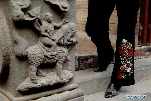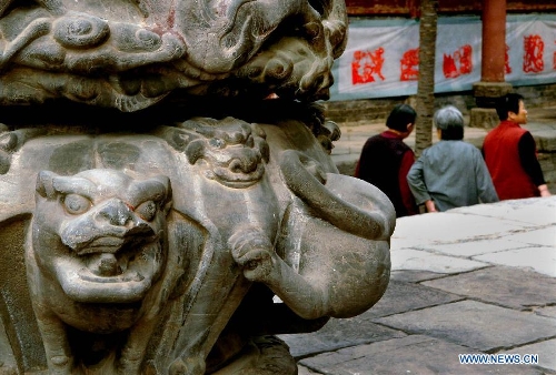 A tourist walks past a sculpted stone column base at Kang Baiwan's Mansion, a 17th-century residential complex, in Gongyi, central China's Henan Province, Dec. 14, 2007. A large number of architectural sculptures have been preserved in historical sites of Henan, which is one of the cradles of the Chinese civilization. Many of the sculptures, created from stones, bricks, or wood, were used as building parts of residences, shrines and memorial archways, among other architecture types. Underlining both the mood and the details, these sculptures have themes including daily life, legends, myths and opera scenes. (Xinhua/Wang Song)