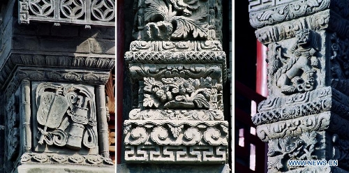This photo combination shows roof sculptures at the Shanxi-Shaanxi-Gansu Guild in Kaifeng, central China's Henan Province, March 6, 2006. A large number of architectural sculptures have been preserved in historical sites of Henan, which is one of the cradles of the Chinese civilization. Many of the sculptures, created from stones, bricks, or wood, were used as building parts of residences, shrines and memorial archways, among other architecture types. Underlining both the mood and the details, these sculptures have themes including daily life, legends, myths and opera scenes. (Xinhua/Wang Song)