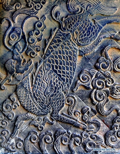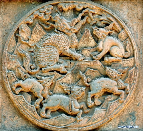 Photo taken on May 24, 2010 shows the brick relief of a Qilin, an auspicious beast in Chinese mythology, at the Anguo Temple in Licun Township of Shanxian County, central China's Henan Province. A large number of architectural sculptures have been preserved in historical sites of Henan, which is one of the cradles of the Chinese civilization. Many of the sculptures, created from stones, bricks, or wood, were used as building parts of residences, shrines and memorial archways, among other architecture types. Underlining both the mood and the details, these sculptures have themes including daily life, legends, myths and opera scenes. (Xinhua/Wang Song)