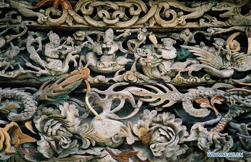 Photo taken on July 15, 2009 shows a coloured wood sculpture under the eaves of a passageway at Ma Piyao's Mansion, a 19th-century residential complex, in Jiangcun Township of Anyang County, central China's Henan Province. A large number of architectural sculptures have been preserved in historical sites of Henan, which is one of the cradles of the Chinese civilization. Many of the sculptures, created from stones, bricks, or wood, were used as building parts of residences, shrines and memorial archways, among other architecture types. Underlining both the mood and the details, these sculptures have themes including daily life, legends, myths and opera scenes. (Xinhua/Wang Song)