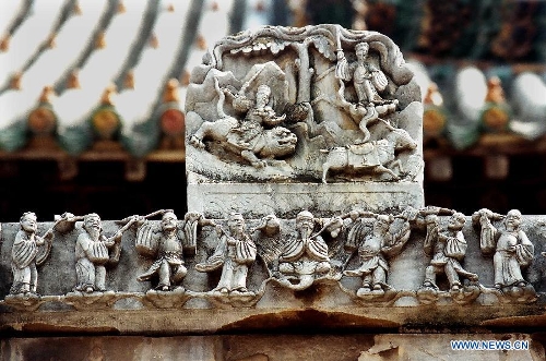 Photo taken on May 24, 2010 shows wood sculptures under the eaves of the main hall of the Anguo Temple in Licun Township of Shanxian County, central China's Henan Province. A large number of architectural sculptures have been preserved in historical sites of Henan, which is one of the cradles of the Chinese civilization. Many of the sculptures, created from stones, bricks, or wood, were used as building parts of residences, shrines and memorial archways, among other architecture types. Underlining both the mood and the details, these sculptures have themes including daily life, legends, myths and opera scenes. (Xinhua/Wang Song)