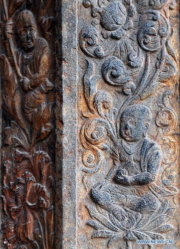 Photo taken on July 30, 2010 shows a Song Dynasty (960-1279 AD) stone relief inside the Chuzu Buddhist Convent in Songshan Mountain, central China's Henan Province. A large number of architectural sculptures have been preserved in historical sites of Henan, which is one of the cradles of the Chinese civilization. Many of the sculptures, created from stones, bricks, or wood, were used as building parts of residences, shrines and memorial archways, among other architecture types. Underlining both the mood and the details, these sculptures have themes including daily life, legends, myths and opera scenes. (Xinhua/Wang Song)