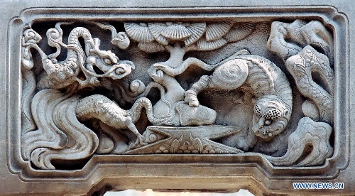 Photo taken on May 24, 2010 shows the stone relief of a Qilin, an auspicious beast in Chinese mythology, at the Anguo Temple in Licun Township of Shanxian County, central China's Henan Province. A large number of architectural sculptures have been preserved in historical sites of Henan, which is one of the cradles of the Chinese civilization. Many of the sculptures, created from stones, bricks, or wood, were used as building parts of residences, shrines and memorial archways, among other architecture types. Underlining both the mood and the details, these sculptures have themes including daily life, legends, myths and opera scenes. (Xinhua/Wang Song)