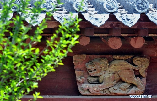 Photo taken on May 24, 2010 shows a Qilin-shaped wood sculpture under the eaves of the main hall of the Anguo Temple in Licun Township of Shanxian County, central China's Henan Province. A large number of architectural sculptures have been preserved in historical sites of Henan, which is one of the cradles of the Chinese civilization. Many of the sculptures, created from stones, bricks, or wood, were used as building parts of residences, shrines and memorial archways, among other architecture types. Underlining both the mood and the details, these sculptures have themes including daily life, legends, myths and opera scenes. (Xinhua/Wang Song)