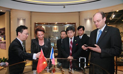 Marie-France Marchand Baylet, the wife of the French Foreign Minister, looks closely at exhibits in the Sino-French Bronze Medal Art Exhibition. Photo: Courtesy of the Shanghai Mint