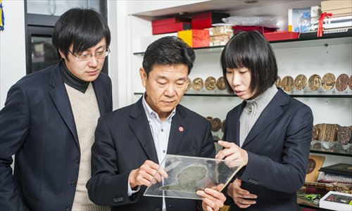 Luo Yonghui (center), deputy general artist at the Shanghai Mint, looks over a pattern with a young designer. Photo: Courtesy of the Shanghai Mint
