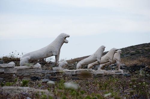 Photo taken on May 28, 2014 shows replicas of stone lions (the original is kept in the Archaeological Museum of Delos) on the island of Delos, Greece. According to Greek mythology, Apollo was born on this tiny island in the Cyclades archipelago. Apollo's sanctuary attracted pilgrims from all over Greece and Delos was a prosperous trading port. The island bears traces of the succeeding civilizations in the Aegean world, from the 3rd millennium B.C. to the palaeochristian era. The archaeological site is exceptionally extensive and rich and conveys the image of a great cosmopolitan Mediterranean port. (Xinhua/Liu Yongqiu)