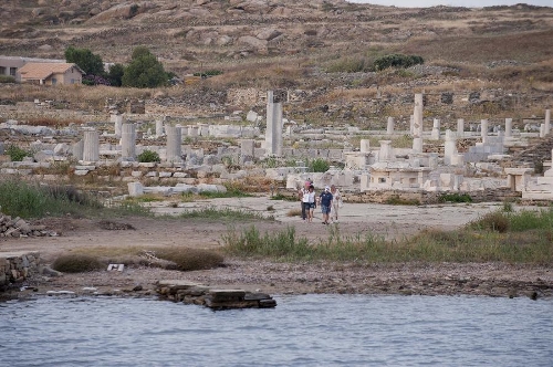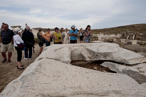 Tourists visit the remains of architecture on the island of Delos, Greece, on May 28, 2014. According to Greek mythology, Apollo was born on this tiny island in the Cyclades archipelago. Apollo's sanctuary attracted pilgrims from all over Greece and Delos was a prosperous trading port. The island bears traces of the succeeding civilizations in the Aegean world, from the 3rd millennium B.C. to the palaeochristian era. The archaeological site is exceptionally extensive and rich and conveys the image of a great cosmopolitan Mediterranean port. (Xinhua/Liu Yongqiu)