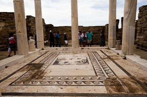 Photo taken on May 28, 2014 shows an ancient folk house named "Dionysos" on the island of Delos, Greece. According to Greek mythology, Apollo was born on this tiny island in the Cyclades archipelago. Apollo's sanctuary attracted pilgrims from all over Greece and Delos was a prosperous trading port. The island bears traces of the succeeding civilizations in the Aegean world, from the 3rd millennium B.C. to the palaeochristian era. The archaeological site is exceptionally extensive and rich and conveys the image of a great cosmopolitan Mediterranean port. (Xinhua/Liu Yongqiu)