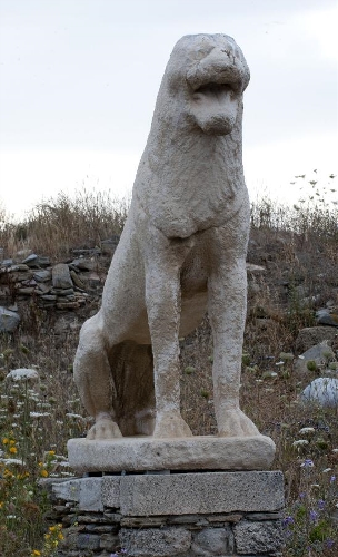 Photo taken on May 28, 2014 shows a replica of a stone lion (the original is kept in the Archaeological Museum of Delos) on the island of Delos, Greece. According to Greek mythology, Apollo was born on this tiny island in the Cyclades archipelago. Apollo's sanctuary attracted pilgrims from all over Greece and Delos was a prosperous trading port. The island bears traces of the succeeding civilizations in the Aegean world, from the 3rd millennium B.C. to the palaeochristian era. The archaeological site is exceptionally extensive and rich and conveys the image of a great cosmopolitan Mediterranean port. (Xinhua/Liu Yongqiu)