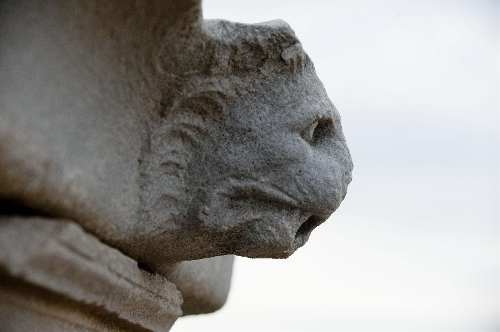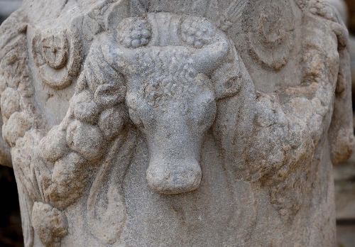 Photo taken on May 28, 2014 shows the decoration of a building on the island of Delos, Greece. According to Greek mythology, Apollo was born on this tiny island in the Cyclades archipelago. Apollo's sanctuary attracted pilgrims from all over Greece and Delos was a prosperous trading port. The island bears traces of the succeeding civilizations in the Aegean world, from the 3rd millennium B.C. to the palaeochristian era. The archaeological site is exceptionally extensive and rich and conveys the image of a great cosmopolitan Mediterranean port. (Xinhua/Liu Yongqiu)
